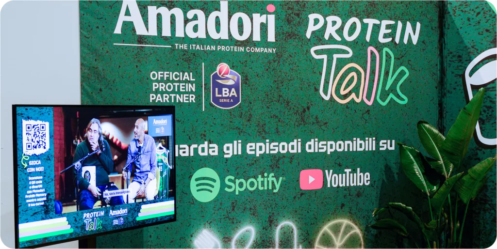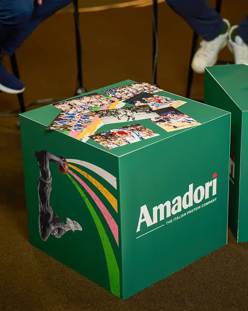 - Visual & convivialità: Il set, allestito direttamente sul parquet, utilizza speciali cubi brandizzati come tavoli d’appoggio per i prodotti Amadori, facilitando la conversazione sui “4 colori delle proteine” in un ambiente informale e colloquiale.