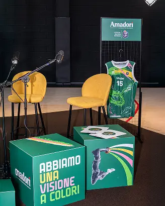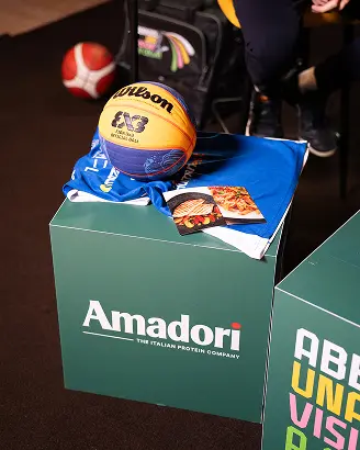 - Visuals & conviviality: the set, set up directly on the court, uses special branded cubes as side tables for Amadori products, facilitating conversation about the ‘4 colours of protein’ in an informal and conversational setting.